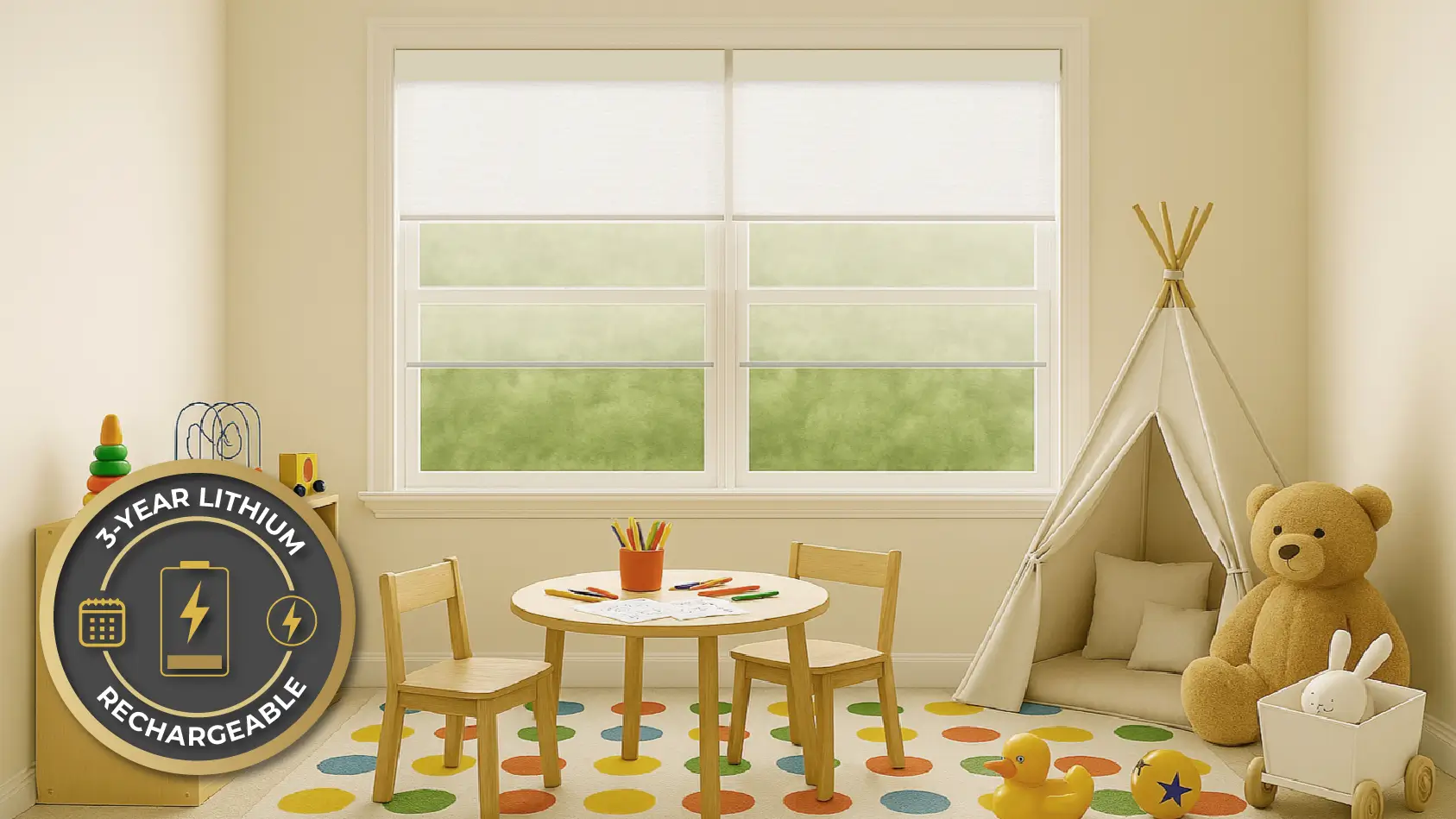 - Niño Duo motorized shades come equipped with a USB-C rechargeable lithium battery.
